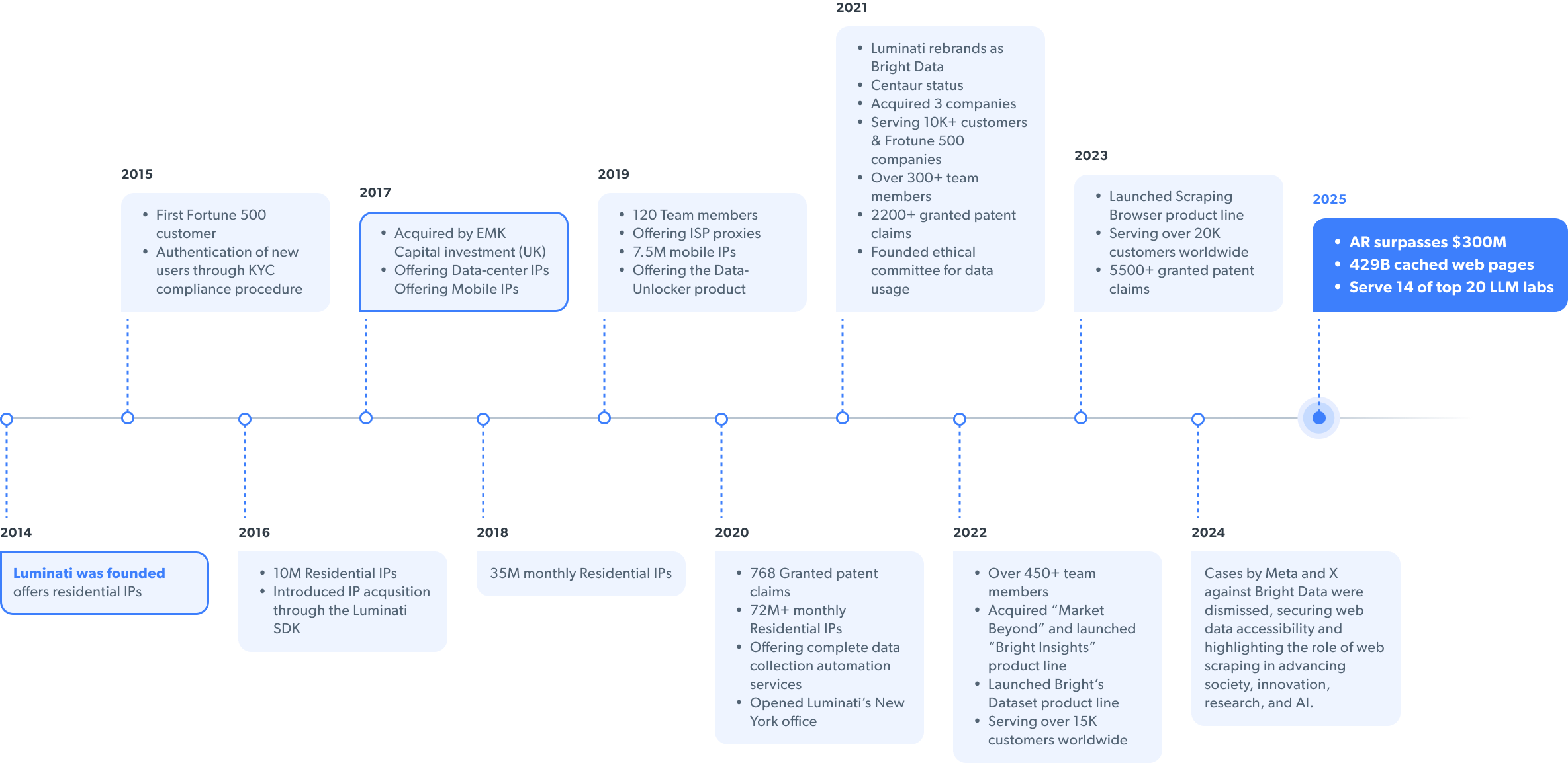 Wir haben uns von einer Proxy-Infrastruktur zur weltweit führenden Plattform für die Erfassung von Webdaten entwickelt. Um unsere Entwicklung zu feiern, haben wir Luminati Networks in Bright Data umbenannt. Heute ist unsere proprietäre Technologie die beste ihrer Art und wird von Fortune-500-Unternehmen, akademischen Einrichtungen und führenden Unternehmen auf der ganzen Welt eingesetzt.