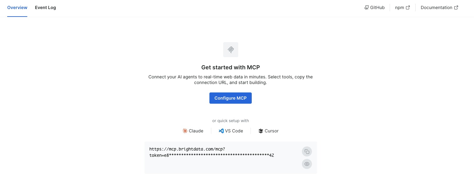 Visit our MCP control panel to access the Configuration Wizard. Enter your API token, select your tools, and get a ready-to-use connection URL.