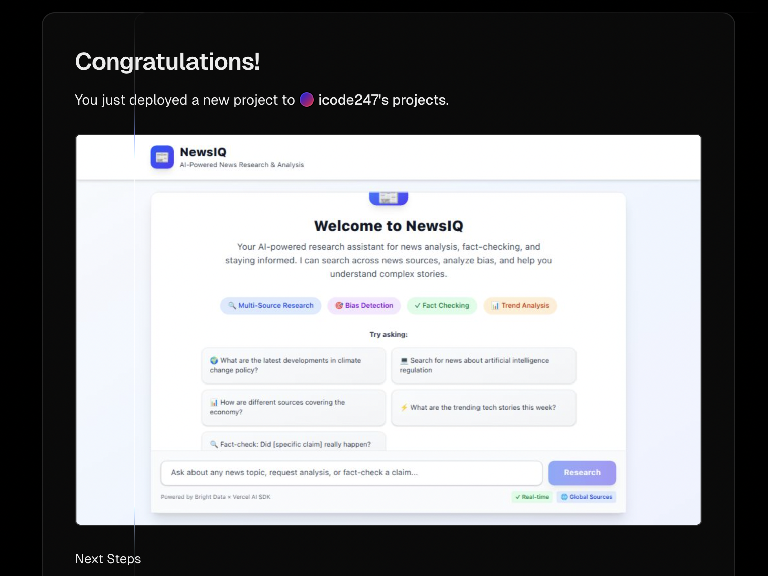Ihre Anwendung wird in 2-3 Minuten unter einer URL wie https://ai-news-assistant.vercel.app live sein .
