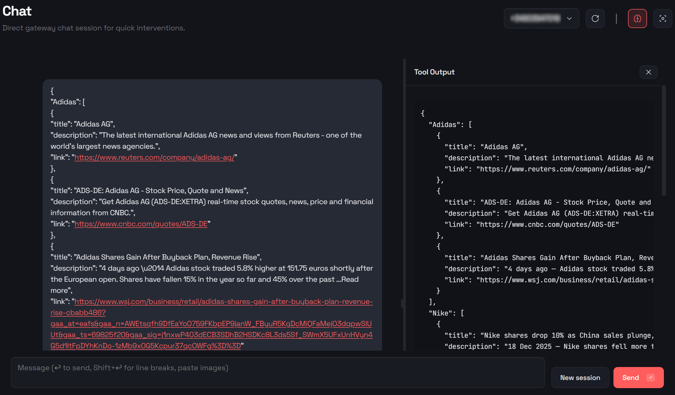 Wenn Sie sich fragen, ob der KI-Assistent tatsächlich eine Verbindung zu Bright Data herstellt (anstatt Ergebnisse zu erfinden), können Sie dies ganz einfach überprüfen. Öffnen Sie den Abschnitt „Chat“ in der Control-Benutzeroberfläche, um detaillierte Protokolle jedes Tool-Aufrufs anzuzeigen: