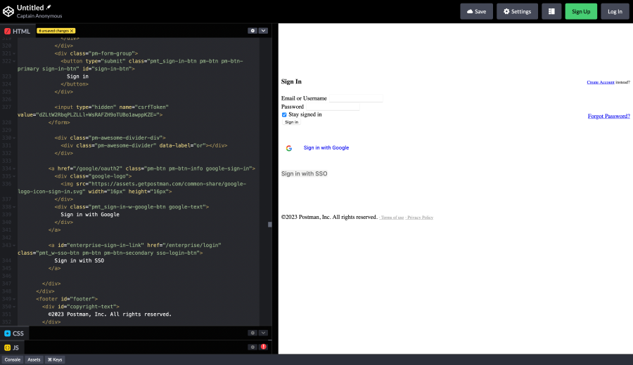 Um dies zu überprüfen, kopieren Sie die curl-Antwort und fügen Sie sie in einen Webeditor Ihrer Wahl ein. Das Ergebnis sollte die HTML-Darstellung der Postman-Anmeldeseite sein:
