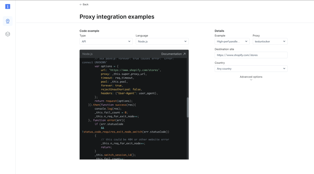 Ihre Zugangsdaten umfassen Ihren Host, Ihren Benutzernamen und Ihr Passwort, die zur Authentifizierung von Proxy-Anfragen verwendet werden. Klicken Sie auf die Schaltfläche „Check out code and integration“ (Code und Integration überprüfen), woraufhin Ihnen ein Curl-Skript angezeigt wird:
