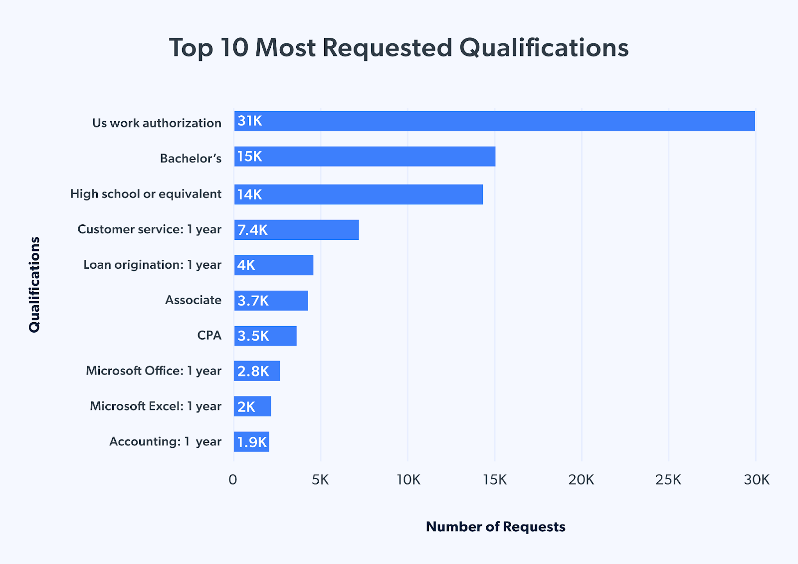 - Die Arbeitserlaubnis für die USA steht mit 30.966 Anforderungen von Arbeitgebern an erster Stelle der Finanzqualifikationen, während Bachelor-Abschlüsse mit 14.570 Anforderungen an zweiter Stelle stehen.