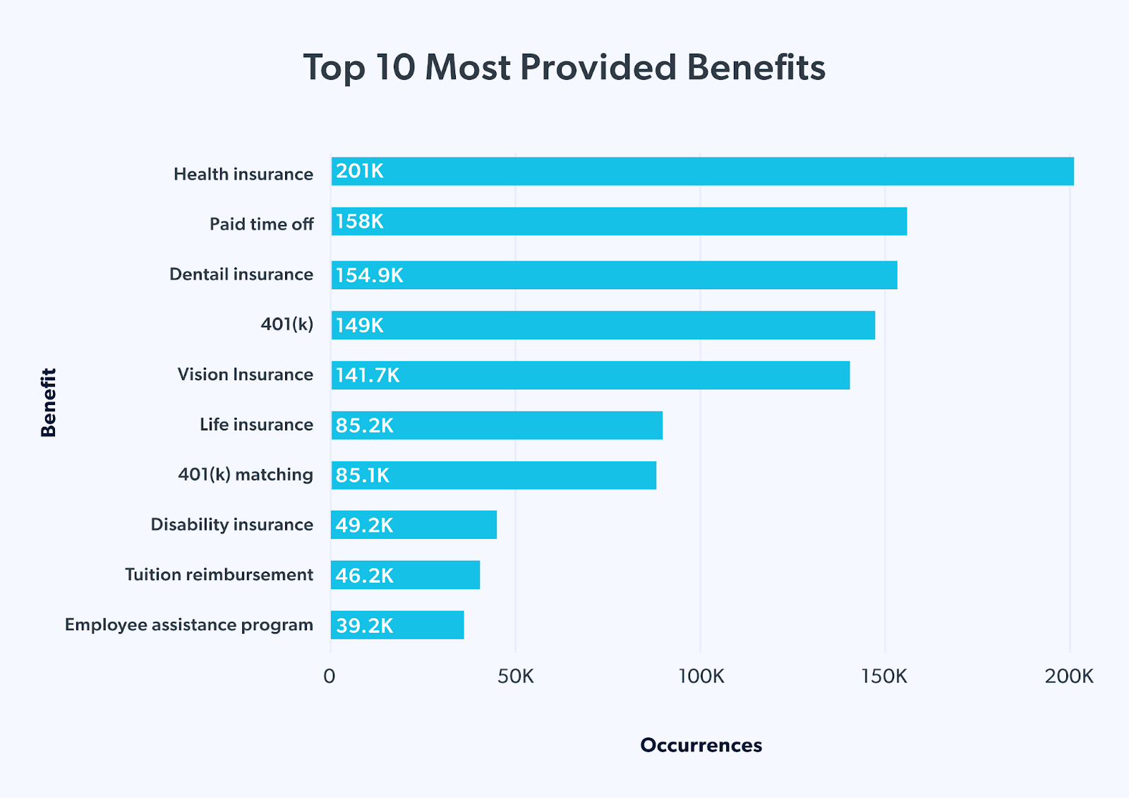 Die fünf häufigsten Leistungen, die in Stellenanzeigen im Finanzbereich angeboten werden, sind Standardversicherungen und -leistungen, die die meisten Bewerber erwarten und die auf dem Arbeitsmarkt üblich sind. Aber nur 30 % der analysierten Stellenanzeigen boten umfangreichere Leistungen wie Lebensversicherung und 401(k) Matching.