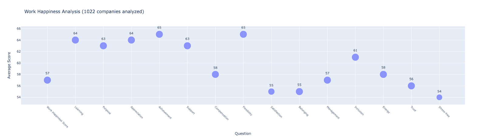 Vergütung (58), Energie (58), Management (57) und Zugehörigkeit (55) haben relativ durchschnittliche Werte. Für Personalmanager bietet diese Erkenntnis die Möglichkeit, Bereiche zu identifizieren, in denen Verbesserungen möglich sind, um die Arbeitsmoral der Mitarbeiter zu steigern.