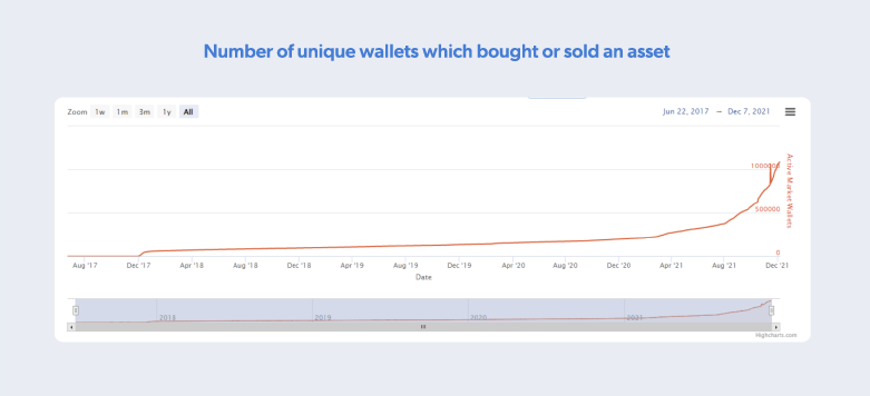 - einzigartigen Wallets, die einen Vermögenswert gekauft oder verkauft haben (was auf ein sehr gesundes Marktvolumen hindeutet)