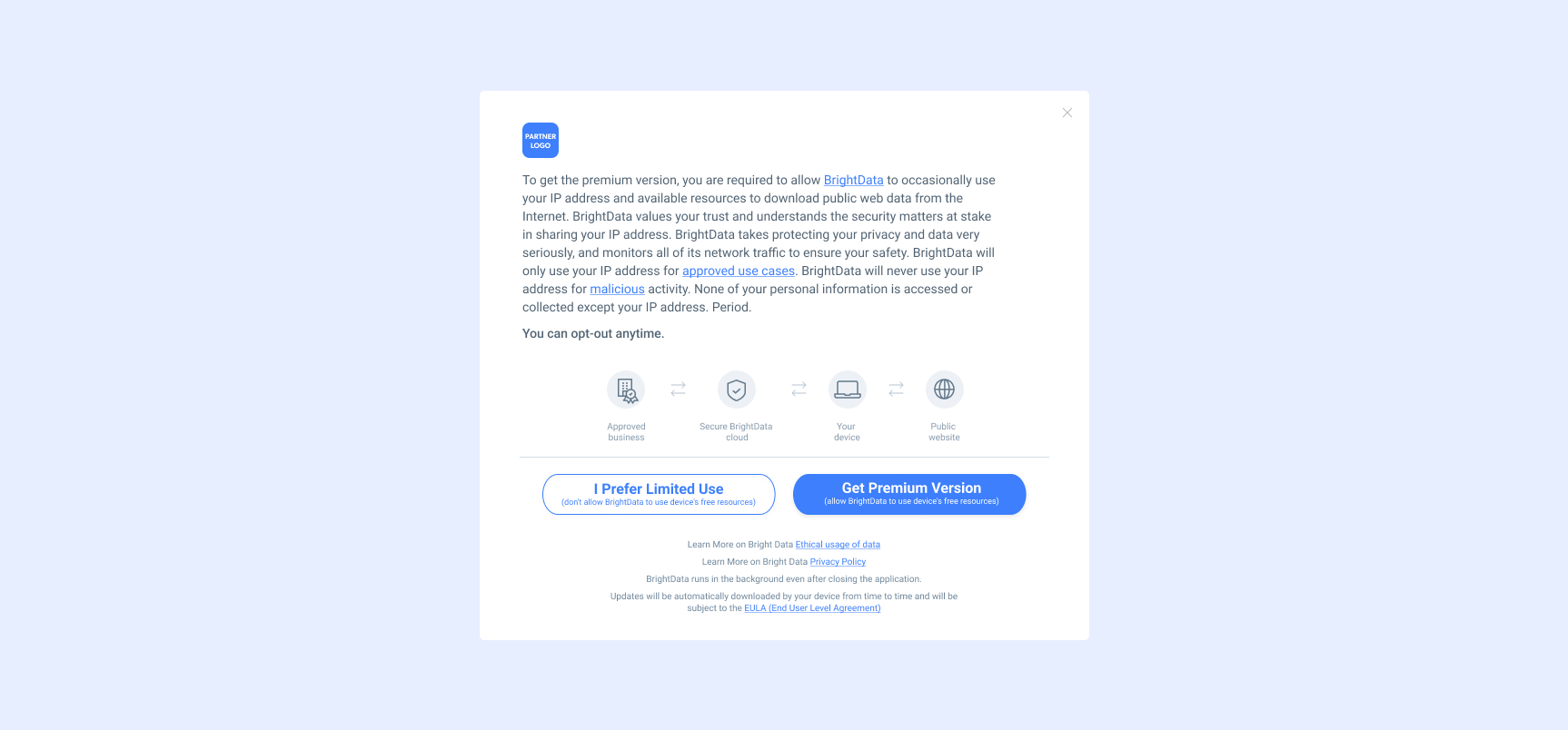 Alle bestehenden und neuen Bright Data SDK-Partner profitieren vom AppEsteem-Programm. Jeder neue Partner wird nun in das Programm aufgenommen. Die Teilnahme ist für den Partner kostenlos; sie wird von Bright Data bezahlt.