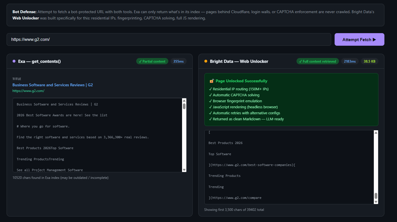 /searchbei Exa beträgt 10 QPS. Bright Data hat kein Limit für gleichzeitige Anfragen. - Der Bright Data Web Unlocker kann gegen Bots geschützte Seiten crawlen. Exa kann das nicht.