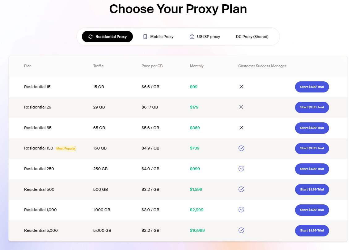 Die Tarife von SOAX sind abonnementbasiert, werden monatlich abgerechnet und sind nach Traffic gestaffelt. SOAX bietet keine kostenlose Testversion an – stattdessen erhalten Sie eine 3-tägige kostenpflichtige Testphase für 1,99 $. Der Tarif beginnt bei 6,6 $ pro GB mit einer Obergrenze von 15 GB und wird mit steigendem Traffic pro GB günstiger. Es gibt kein Pay-as-you-go-Modell.