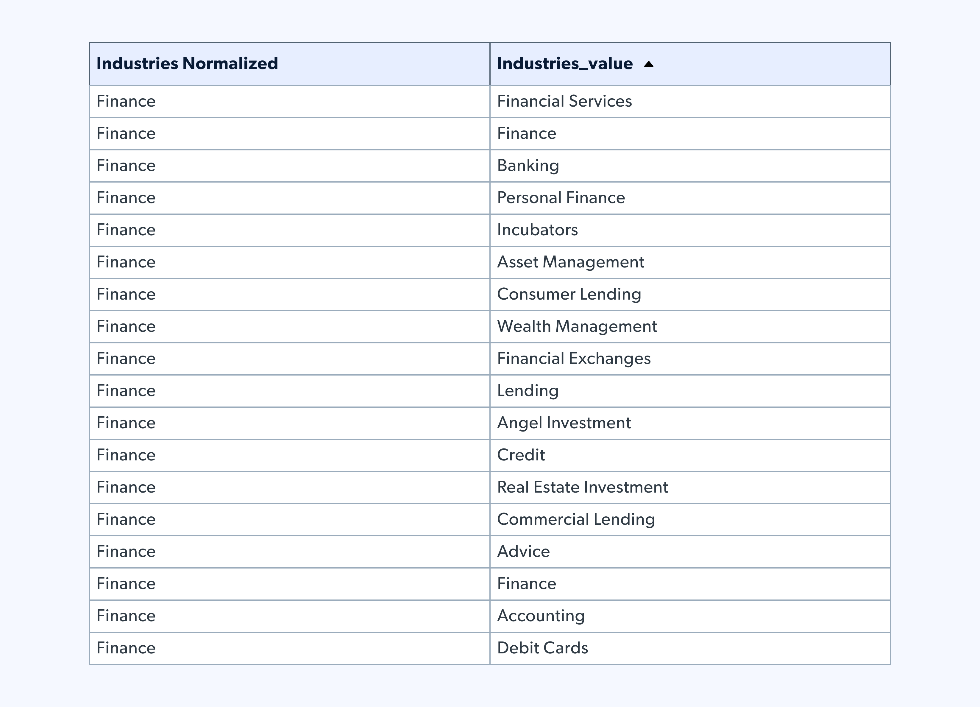 Ein weiterer Grund für die Kategorisierung auf normalisierter Ebene ist das Format der exportierten Crunchbase-Daten: Eine Investition kann mehrfach aufgeführt werden, wenn sie mehreren Branchen zugeordnet ist.