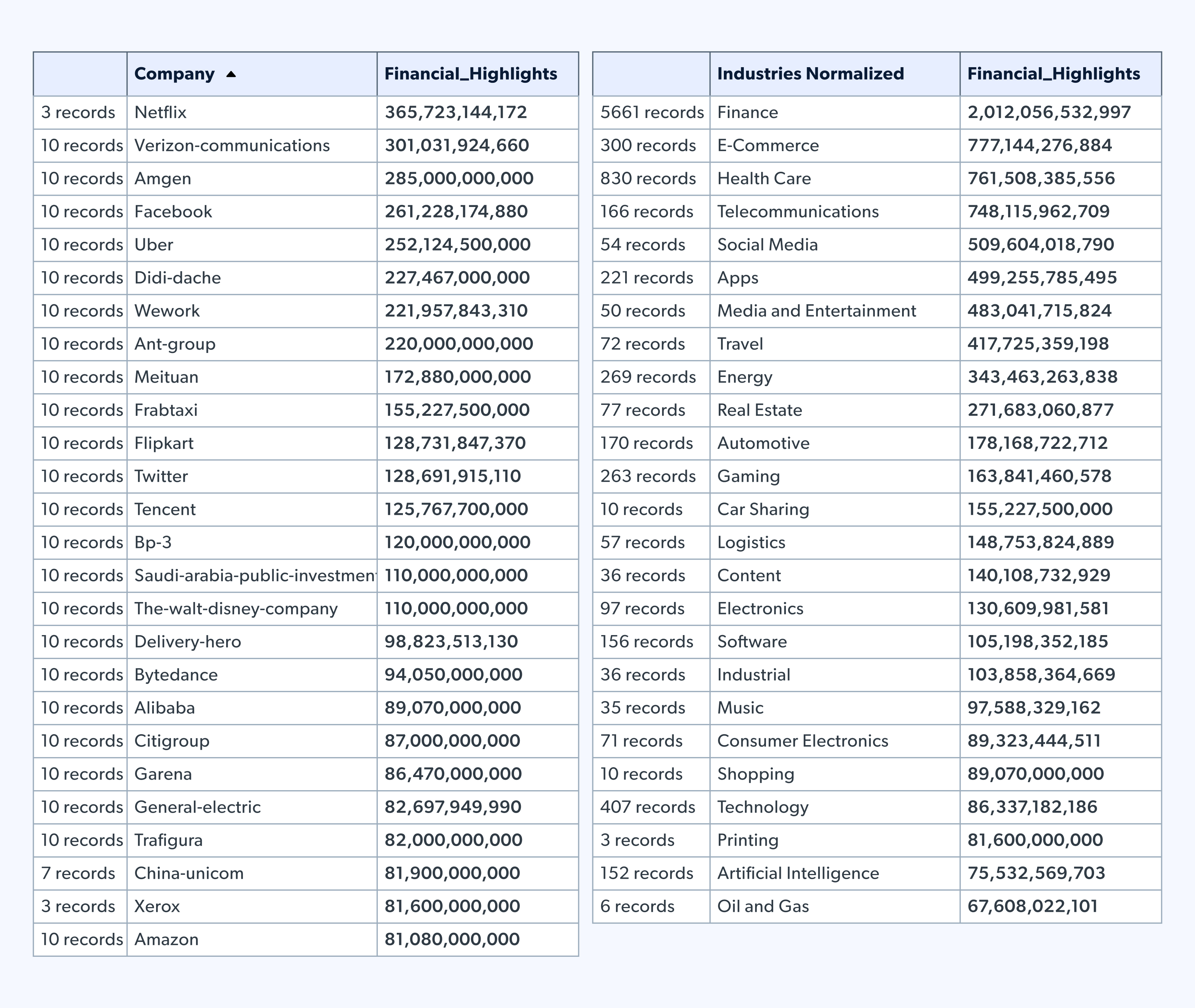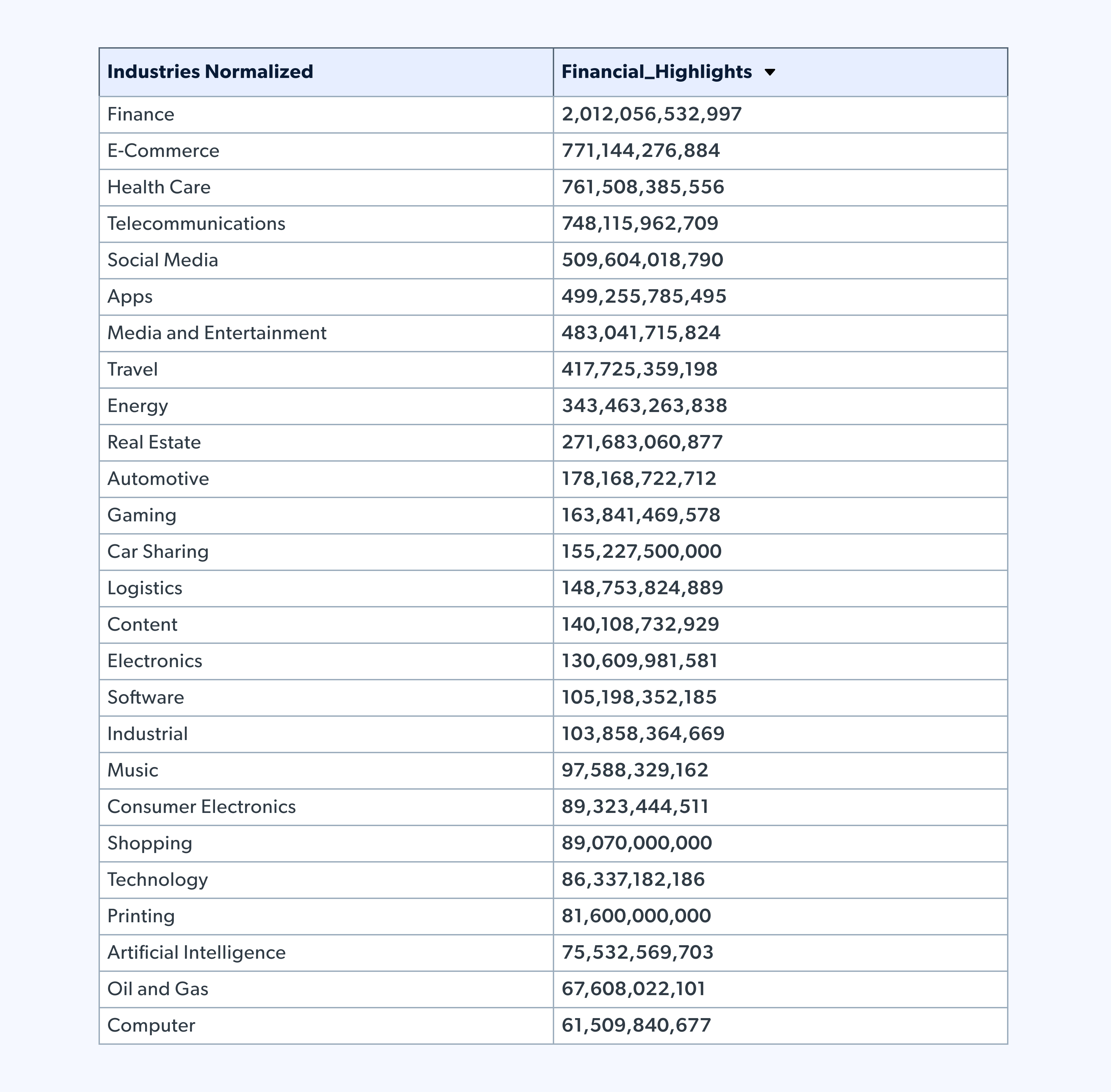 Wie kann das sein? Die einfache Antwort lautet: Es hängt von der Anzahl der Unternehmen in der Branche ab, wie viel sie investieren, wie oft und in welcher Höhe. Diese Daten zeigen, dass Netflix drei Investitionen getätigt hat, während der Finanzsektor insgesamt 5661 Investitionen getätigt hat. Es gibt weit mehr Unternehmen im Finanzsektor als in der Unterhaltungsbranche, weshalb die beiden Listen sehr unterschiedlich aussehen.