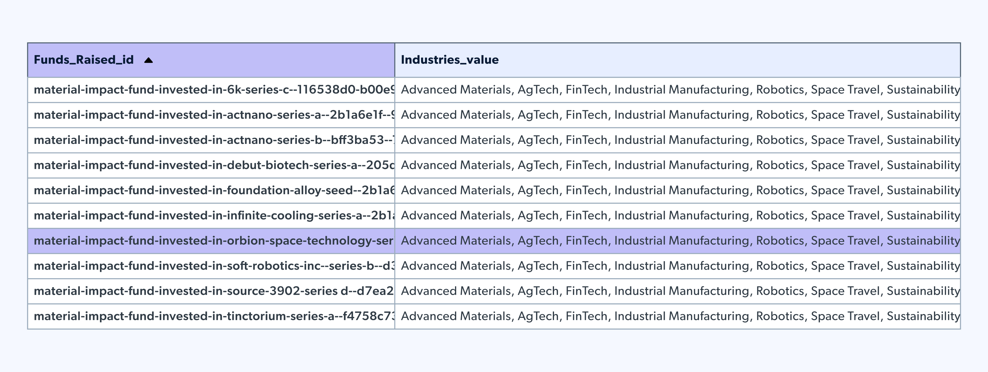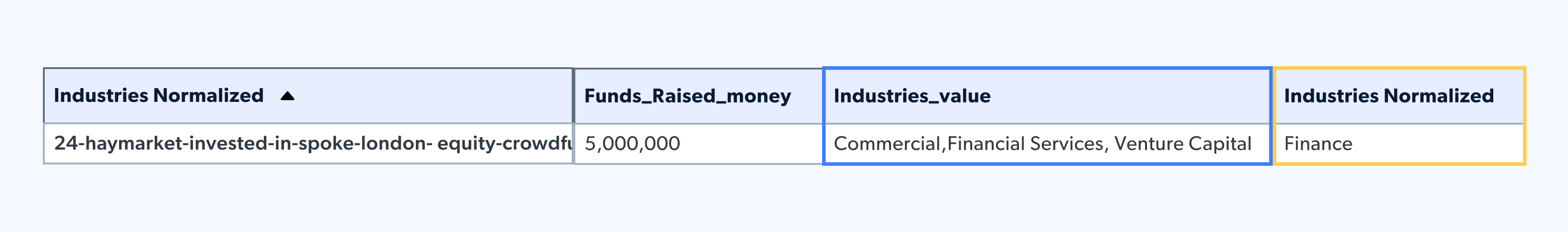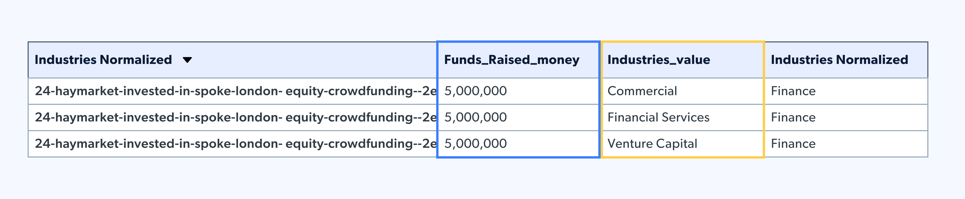 Das bedeutet, dass der Investitionsbetrag wiederholt wird, sodass im obigen Beispiel die Gesamtinvestition 5 Millionen Dollar und nicht 15 Millionen Dollar beträgt. Um Doppelzählungen zu vermeiden, können wir die Spalte „Funds Raised ID” (aufgebrachte Mittel) aggregieren, den eindeutigen Wert der Investition anzeigen und dennoch die einzelnen Branchen als Liste beibehalten.