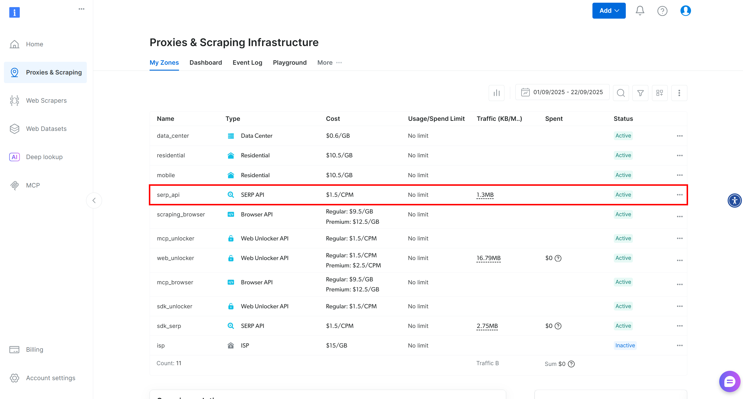 Überprüfen Sie die Tabelle „My Zones“, in der Ihre konfigurierten Bright Data-Produkte aufgelistet sind. Wenn bereits eine aktive SERP-API-Zone vorhanden ist, können Sie loslegen. Kopieren Sie einfach den Namen der Zone (in diesem Fallserp_api), da Sie ihn später benötigen werden.