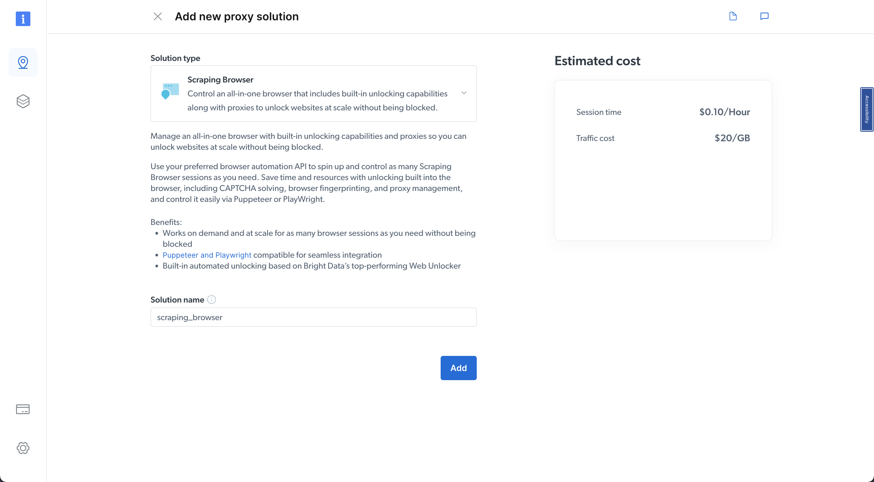 Gehen Sie zu Ihrem Bright Data-Dashboard und klicken Sie auf das Pin-Symbol, um zur Seite „Proxy & Scraping-Infrastruktur“ zu gelangen. Klicken Sie dann auf „Add“ > „Scraping-Browser“: