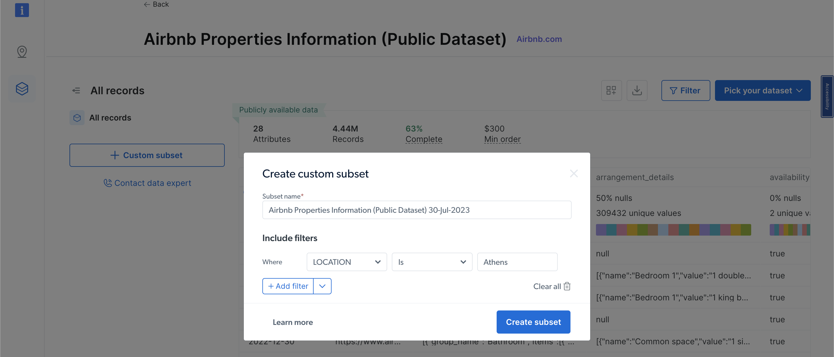 Wenn Ihnen das manuelle Scraping von Daten oder das Einrichten von Skripten zu zeitaufwändig oder komplex erscheint, sind die benutzerdefinierten Datensätze von Bright Data eine hervorragende Alternative. Sie bieten einen Airbnb-Datensatz mit Informationen zu Airbnb-Immobilien, auf den Sie zugreifen und den Sie analysieren können, ohne selbst Scraping durchführen zu müssen.