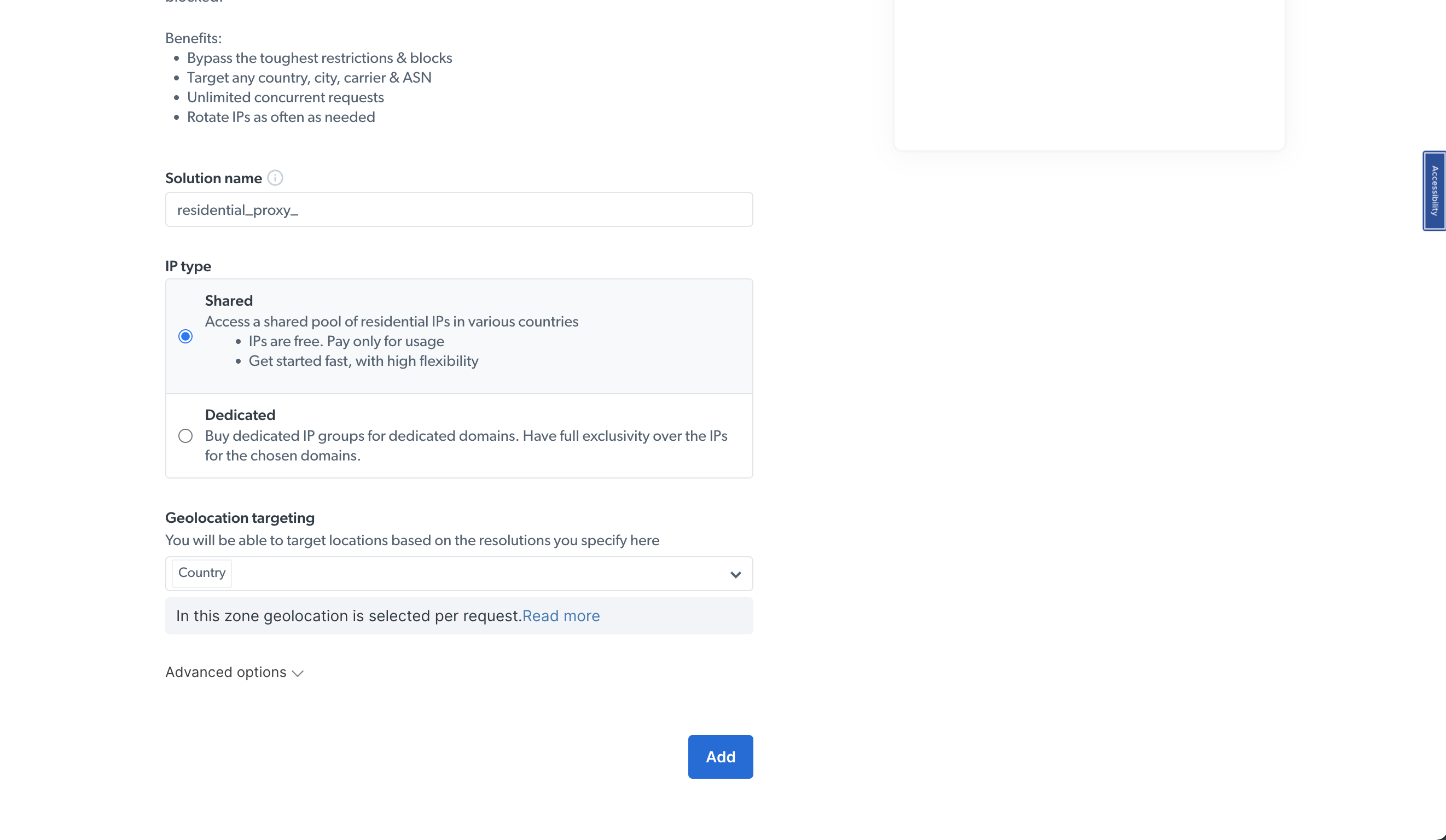 Geben Sie Ihrem Proxy einen Namen (z. B. residential_proxy1) und wählen Sie unter „IP-Typ“ die Option „Gemeinsam genutzt “. Klicken Sie dann auf „Hinzufügen“: