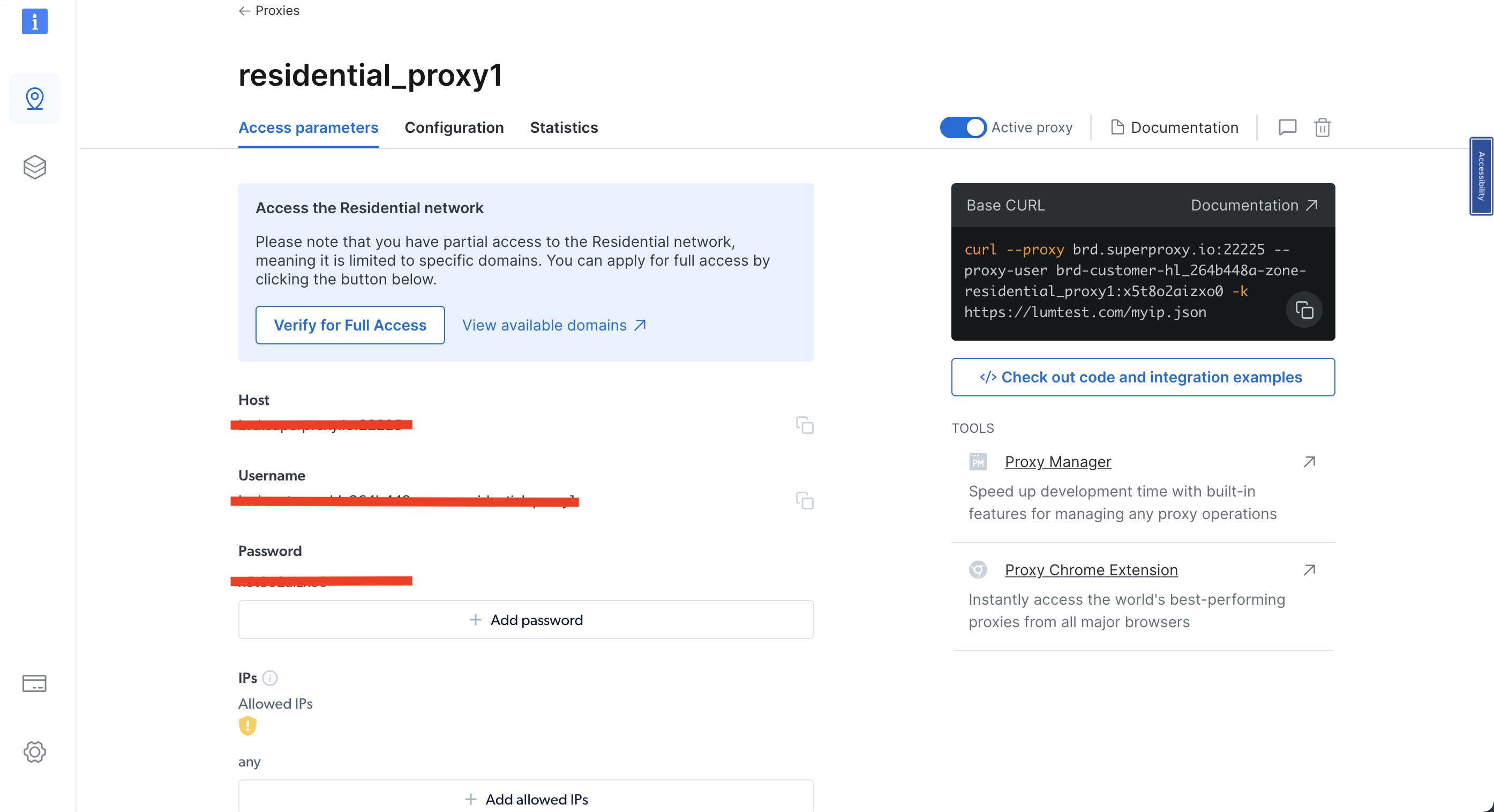 Nachdem Sie Ihren Residential-Proxy erstellt haben, notieren Sie sich die Zugriffsparameter, da Sie diese Angaben in Ihrem Code verwenden müssen: