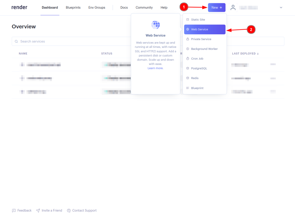 Klicken Sie auf die Schaltfläche Neu + und wählen Sie Web Service: