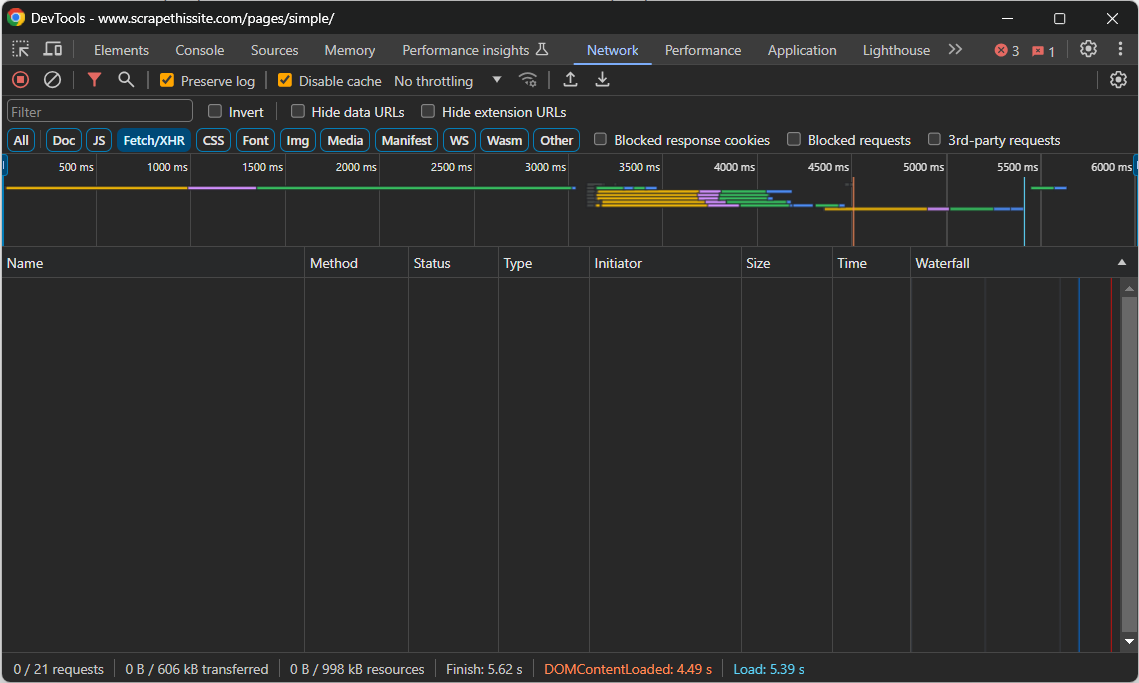 Während die Seite geladen und gerendert wird, bleibt dieser Abschnitt leer. Das bedeutet, dass die Webseite keine AJAX-Anfragen stellt. Mit anderen Worten: Sie ruft keine Daten dynamisch über JavaScript auf dem Client ab. Es handelt sich also um eine statische Inhaltsseite, deren HTML-Dokument bereits alle relevanten Daten enthält.